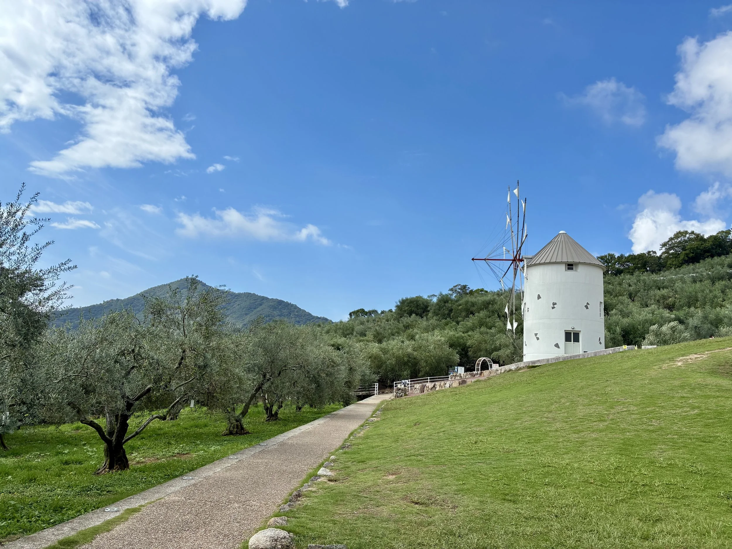 Olive Park, with its 2,000 olive groves, is surrounded by olive trees on all sides, making it feel like you're on the Mediterranean coast. Shodoshima's warm, dry, and sunny climate is ideal for olive orchards, making it the birthplace of olives in Japan. Olive Park is filled with an exotic atmosphere, with a windmill built as a commemoration of friendship between Shodoshima Island and Milos, in Greece, which has a sister island relationship with Shodoshima, and a set used in the filming of the live-action "Kiki's Delivery Service." The olive soft serve ice cream I had at the souvenir shop was also delicious. I bought olive somen noodles, Sanuki udon noodles, and soy sauce as souvenirs from Shodoshima.